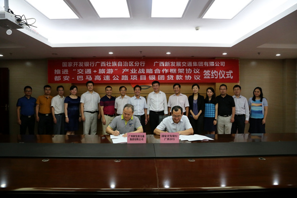 6月9日,集團公司與國家開發(fā)銀行廣西分行在南寧簽訂戰(zhàn)略合作框架協(xié)議。集團公司黨委書記、董事長朱堅和,黨委副書記、副董事長、總經(jīng)理唐咸秋,黨委委員、總會計師鄧遠(yuǎn)志,國家開發(fā)銀行廣西分行黨委書記、行長謝志軍,副行長呂軍等領(lǐng)導(dǎo)出席簽約儀式。簽約前,雙方進行了友好會談,雙方重點圍繞賀州至巴馬高速公路、融水至河池高速公路、國省干線公路及沿線地區(qū)的“交通+旅游”項目開展深度戰(zhàn)略合作等方面進行了深入的交流與探討,并達成了一致共識。座談會后,唐咸秋與呂軍分別代表雙方簽訂戰(zhàn)略合作框架協(xié)議。雙方有關(guān)部門負(fù)責(zé)人參加簽約儀式。(集團公司 投資改革發(fā)展部)