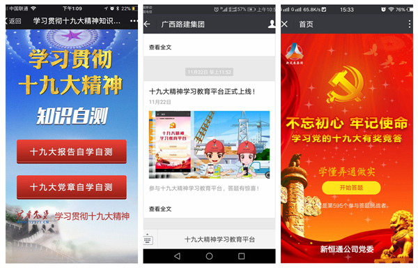 為了深入學(xué)習(xí)宣傳貫徹黨的十九大精神,營(yíng)造濃厚學(xué)習(xí)氛圍,集團(tuán)公司積極探索“互聯(lián)網(wǎng)+黨建”的新模式,在微信公眾平臺(tái)推出學(xué)習(xí)貫徹十九大精神知識(shí)自測(cè)、十九大精神學(xué)習(xí)教育有獎(jiǎng)答題等平臺(tái),吸引了大批黨員群眾自發(fā)上線答題測(cè)試,取得了顯著效果。